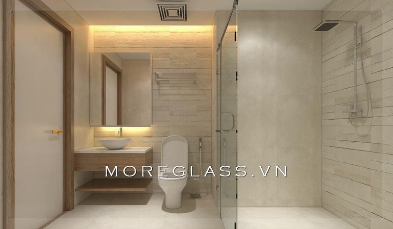 Phòng tắm hiện đại được thiết kế với những kệ tủ trang trí, tủ lavabo đơn giản nhưng hiện đại, cùng với các thiết bị vệ sinh và phòng tắm kính đẹp.