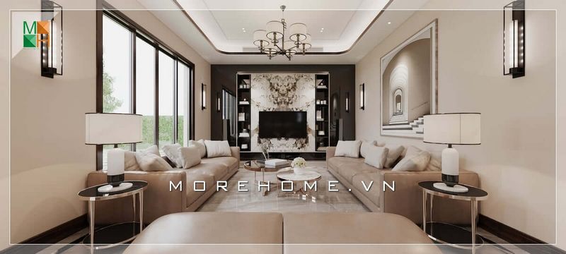 Thiết kế không gian phòng khách thông tầng với đầy đủ những nội thất tiện nghi mang đến 1 chất lượng cuộc sống hoàn mỹ cho mọi thành viên trong gia đình.