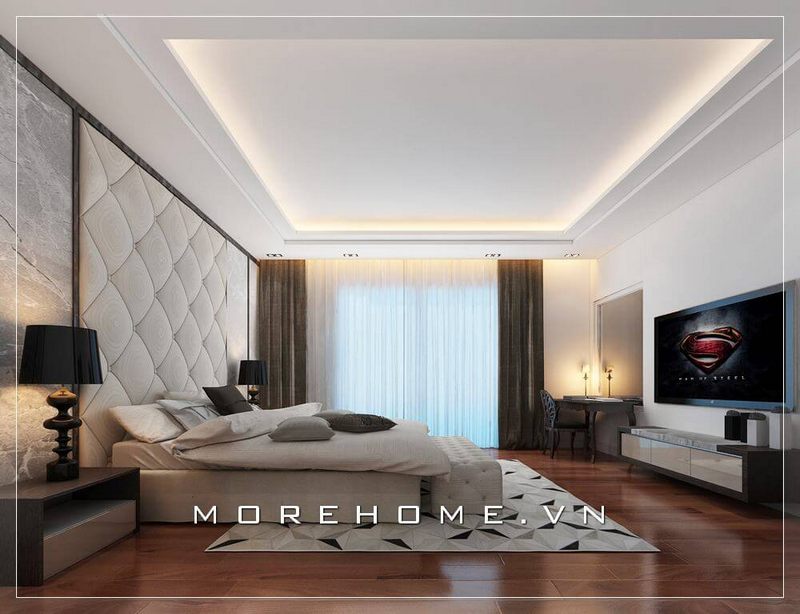 Nội thất phòng ngủ biệt thự hiện đại, tiện nghi và đầy tinh tế hơn cả bởi phần tường vách đầu giường được ốp với chất liệu cùng tone màu với chiếc giường.