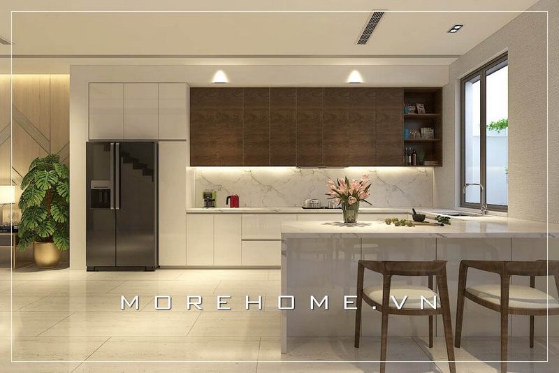 Kiến trúc sư MoreHome đã giới thiệu một mẫu thiết kế nội thất cho phòng bếp liền phòng khách của căn hộ. Hệ thống tủ bếp được chia thành nhiều ngăn để đựng đồ và có quầy bar trẻ trung được kết hợp làm bàn ăn.